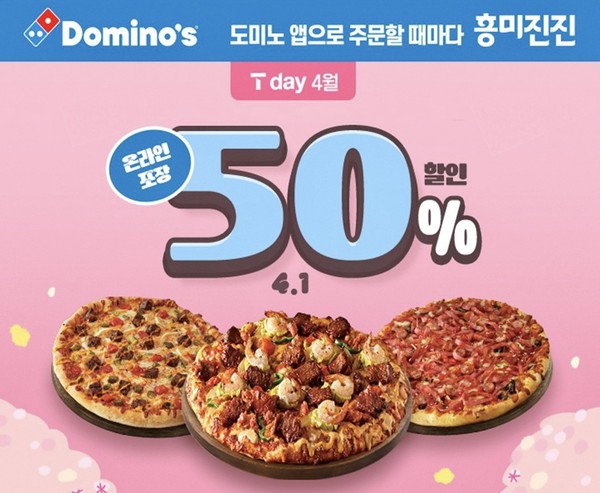 글로벌 피자 리더 도미노가 SKT T멤버십 고객들에게 50% 할인이나 적립 혜택을 제공하는 4월의 ‘SKT T day’ 프로모션을 진행한다.